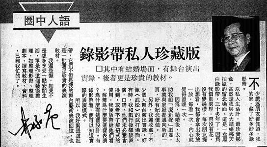 林先生曾透過報章, 以連續刊載方式, 與讀者分享他對藝術,家庭及人生的感想. 現在, 一起來重溫林先生的心路力程吧! 一切都是華光師父所賜 錄影帶私人珍藏版 不睇林家聲 當不成姑爺 你肯學 我肯教 我在加又買了一間屋 我患了"老人痴呆" 我曾經"犯法" 最喜演繹歷史人物 聲氣重於 "滿堂紅" 拍擋花旦換幾人合作愉快講緣份 我願做擋風屏風 當年娶妻不為父諒 兒子交友絕對自由 多謝娘子 富時須向窮時想 人心難測要提防 成功的唯一途徑 - 勤學. 苦練. 多想 演戲我所愛 有機會發揮 - "痴" 大半生 舞台上閃過 | 訪問 | 劇情簡介 | | 林家聲先生於大公報之連載 |